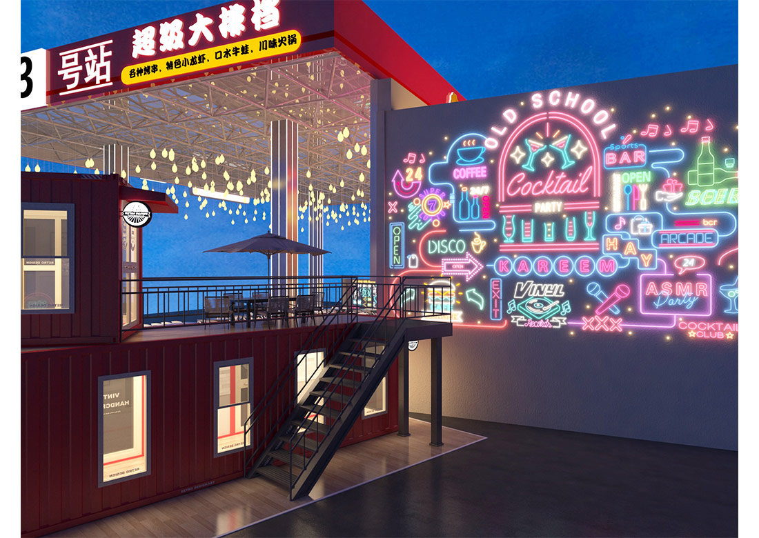 設計理念: 集裝箱大排檔裝修效果圖展現(xiàn)出了各種元素相互碰撞從而打造出完美融合。在總體布局上來說采用了集裝箱的利用和加油站的輪廓,再經(jīng)過精美的裝飾,該濟南店面裝修能激發(fā)了顧客們的消費興趣與獨特的審美觀點。在墻面上掛上每家小吃的精美照片,為大排檔吸引來更多的人群。