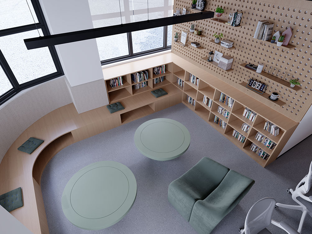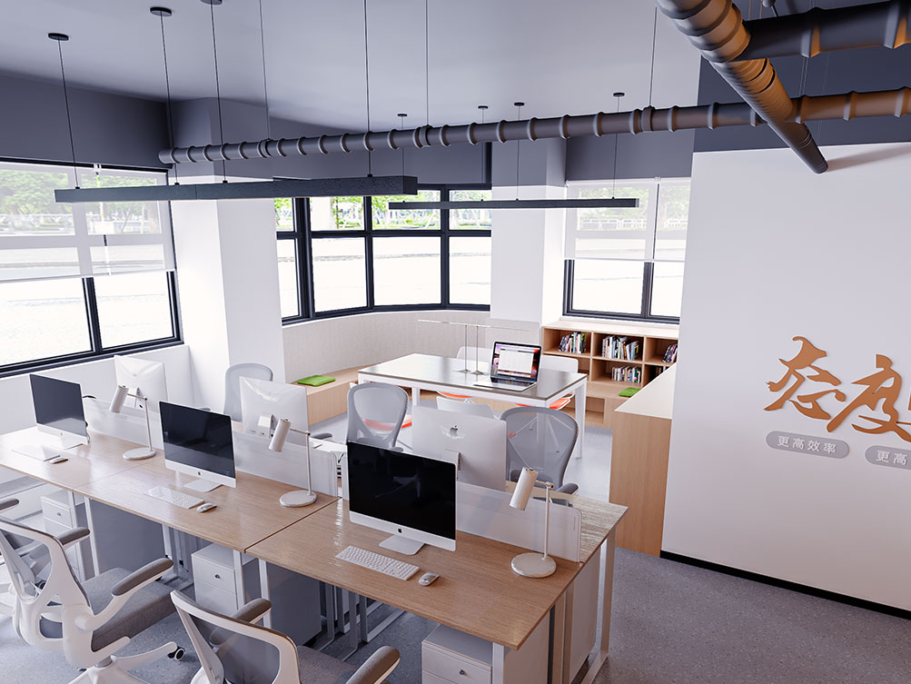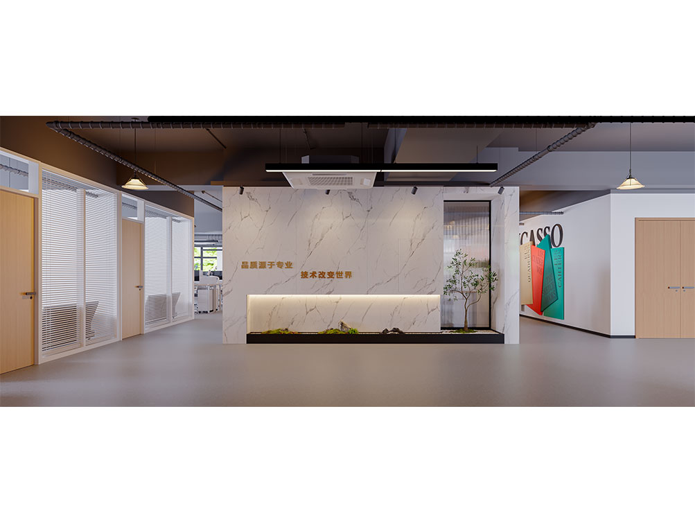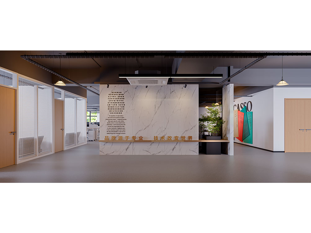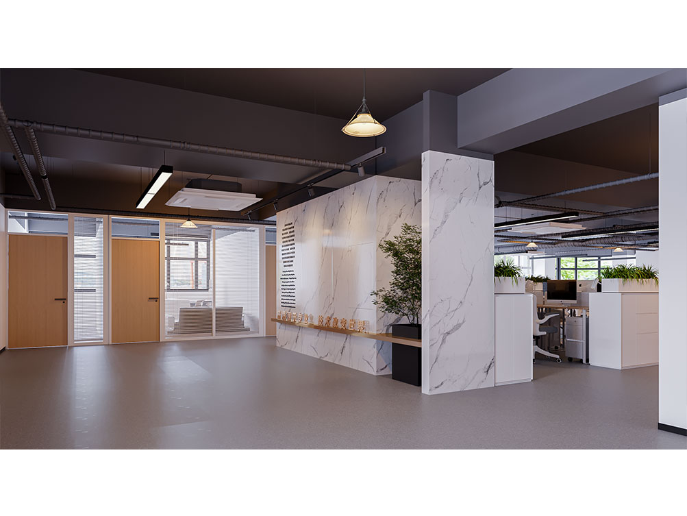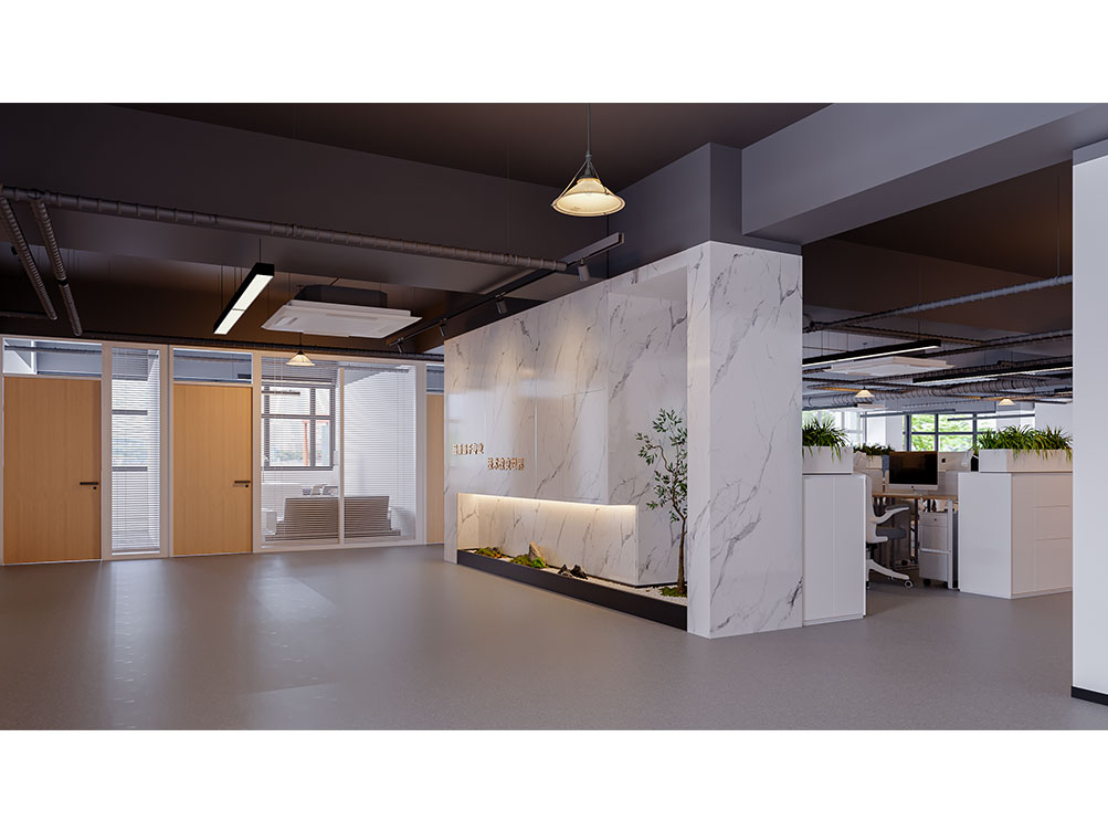 設(shè)計(jì)理念: 作為濟(jì)南辦公室裝修中年輕化辦公空間的代表,博納生物二樓以裸露管道 + 深灰頂?shù)墓I(yè)肌理打底,搭配白調(diào)柜體與原木色工位,平衡冷硬與柔和。白色花箱綠植穿插其間,墻面創(chuàng)意裝飾注入活力,契合濟(jì)南辦公室裝修 “功能 + 美學(xué)” 的設(shè)計(jì)需求,是濟(jì)南科創(chuàng)企業(yè)辦公空間的個(gè)性范本。