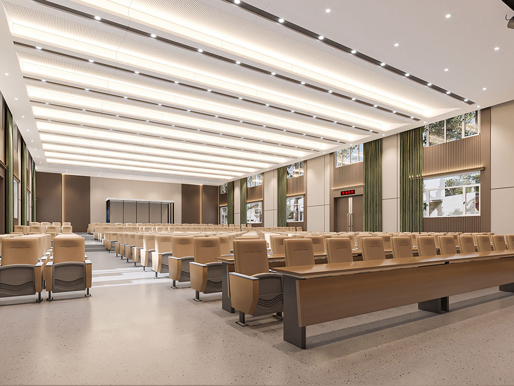 設(shè)計理念: 作為濟南辦公室裝修中大型功能空間的代表,該大堂報告廳以沉穩(wěn)木飾面 + 金屬線條鋪陳基調(diào),頂部穿孔吊頂搭配嵌入式燈光,兼顧聲學與視覺通透感。巨幅電子屏 + 對稱音響設(shè)備適配會議、匯報需求,米色座椅與紅色臺階營造莊重又舒適的氛圍,是濟南辦公室裝修中高規(guī)格功能空間的典型設(shè)計。